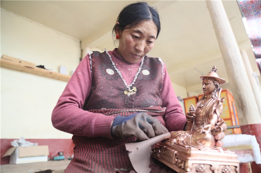 手工藝者布姆正在打磨銅鑄佛像。靠手工技藝,布姆有著穩(wěn)定收入,于去年實現(xiàn)了脫貧。