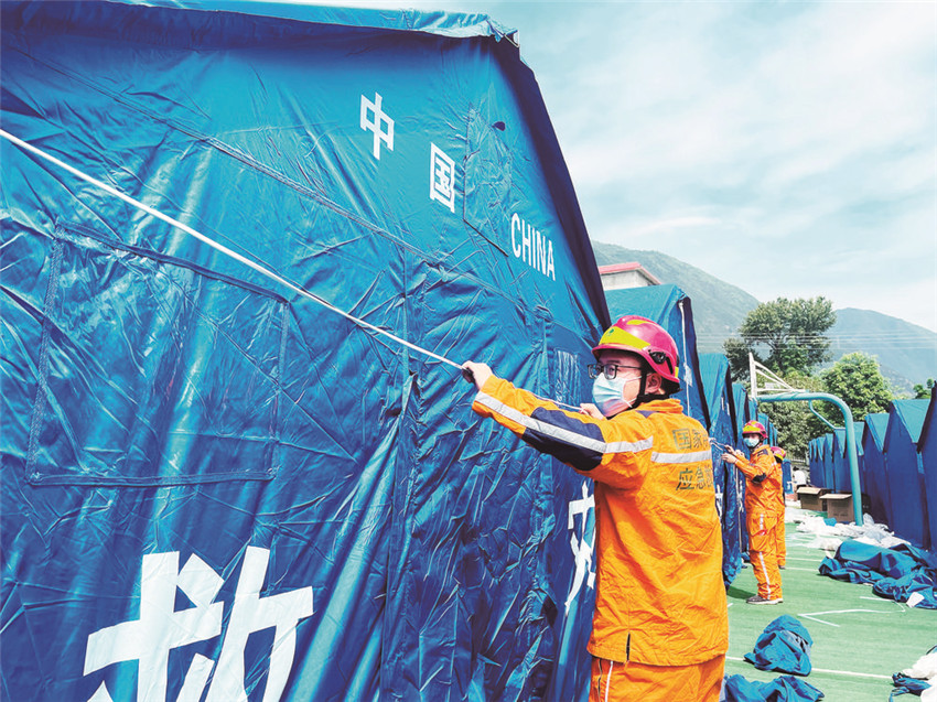 9月8日,當(dāng)救援隊(duì)伍陸續(xù)離開磨崗嶺村的時候,一頂頂藍(lán)色的帳篷已經(jīng)搭建完畢,村民們已經(jīng)全數(shù)搬進(jìn)救災(zāi)帳篷。記者獲悉,后續(xù)救援物資將通過被搶通的道路陸續(xù)運(yùn)抵村子。