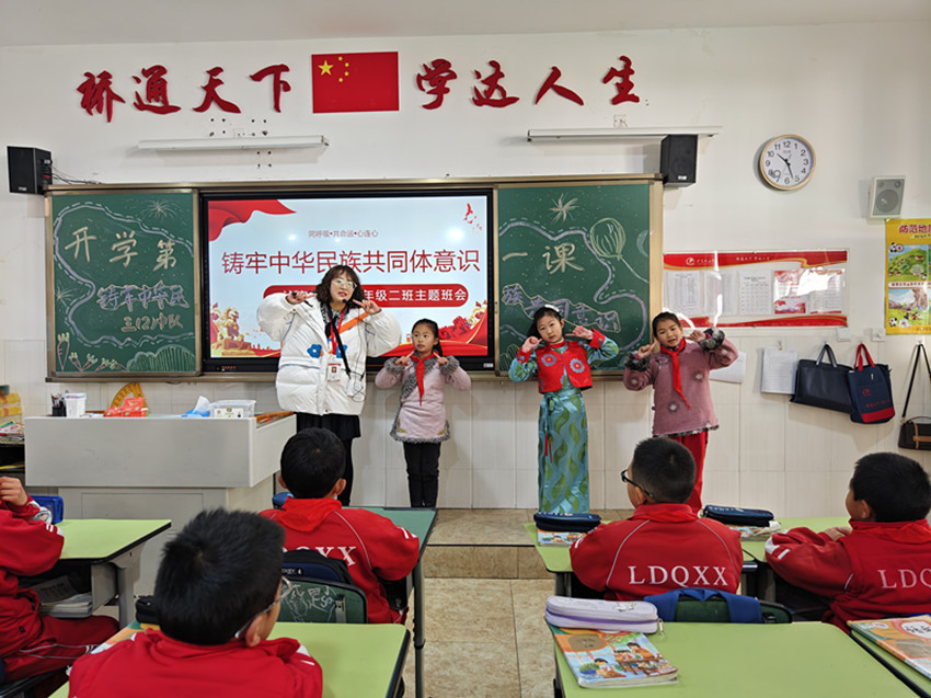 “同學(xué)們,新學(xué)期新起點(diǎn),沐浴著紅城綠谷春的氣息,我們定要同努力、共奮進(jìn),健康成長(zhǎng),揚(yáng)眉‘兔’氣!”典禮一結(jié)束,學(xué)生回到教室后,各班班主任便結(jié)合班級(jí)情況,開(kāi)展以“鑄牢中華民族共同體意識(shí)”為主題的“開(kāi)學(xué)第一課”班會(huì)活動(dòng)。