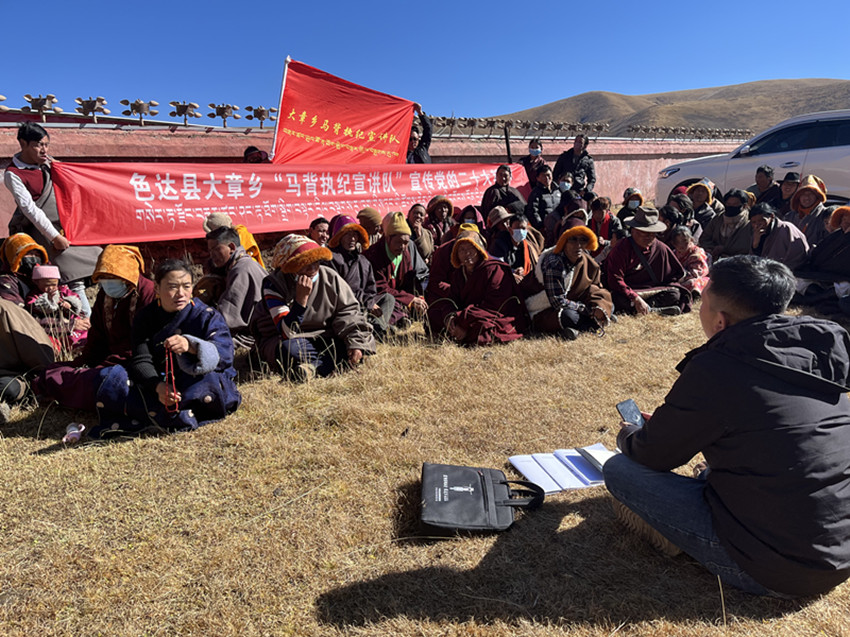 “黨的二十大報(bào)告提出,增進(jìn)民生福祉,提高人民生活品質(zhì)……”“中國共產(chǎn)黨第二十屆中央紀(jì)律檢查委員會(huì)第二次全體會(huì)議要求,堅(jiān)決整治各種損害群眾利益的腐敗問題……”在大章鄉(xiāng)青塔貢瑪壩子上,鄉(xiāng)紀(jì)委書記洛絨洛伍帶領(lǐng)的宣講隊(duì),與確倉村和嘎志瑪一村、二村的150余名農(nóng)牧民群眾圍坐在一起。從黨的各項(xiàng)惠民利民富民政策的落實(shí),到干部背包入戶結(jié)對(duì)幫扶的實(shí)例,從村子水電路等基礎(chǔ)設(shè)施的變化,再到人居環(huán)境改善、便捷就醫(yī)入學(xué)給大家?guī)淼膶?shí)惠……洪亮的藏漢雙語聲中,隊(duì)員們接力展開宣講。
