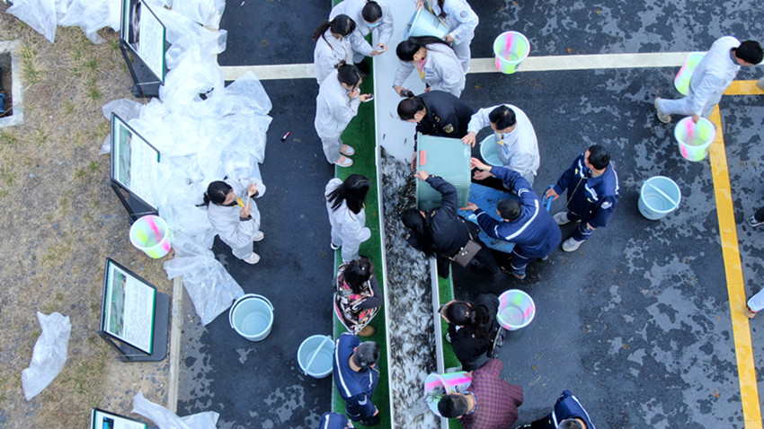 縣農牧農村和科技局工作人員與市民一起將長絲裂腹魚、短須裂腹魚、四川裂腹魚等魚苗放入雅礱江。