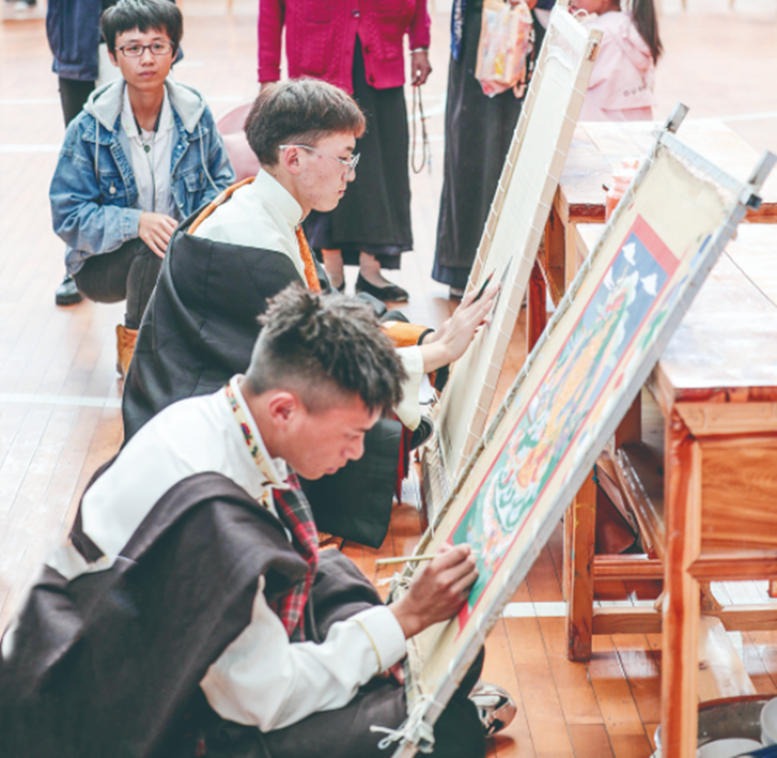 曲久澤仁是郎卡杰畫派的第九代傳人,也是省級(jí)非遺傳承人。他一直在爐霍縣郎卡杰唐卡實(shí)訓(xùn)基地傳授郎卡杰唐卡技藝。該基地是成都市錦江區(qū)投入援建資金1000余萬元的對(duì)口幫扶項(xiàng)目,于2017年投入使用?;孛赓M(fèi)招收貧困學(xué)員學(xué)習(xí)唐卡技藝。經(jīng)過多年發(fā)展,學(xué)校現(xiàn)有教職員工16人,畢業(yè)學(xué)員達(dá)280余人。這些學(xué)員年均收入5萬元左右,實(shí)現(xiàn)了“學(xué)會(huì)一技、就業(yè)一人、致富一家”的目標(biāo),保護(hù)非物質(zhì)文化遺產(chǎn),弘揚(yáng)了傳統(tǒng)文化,助力爐霍鄉(xiāng)村振興。