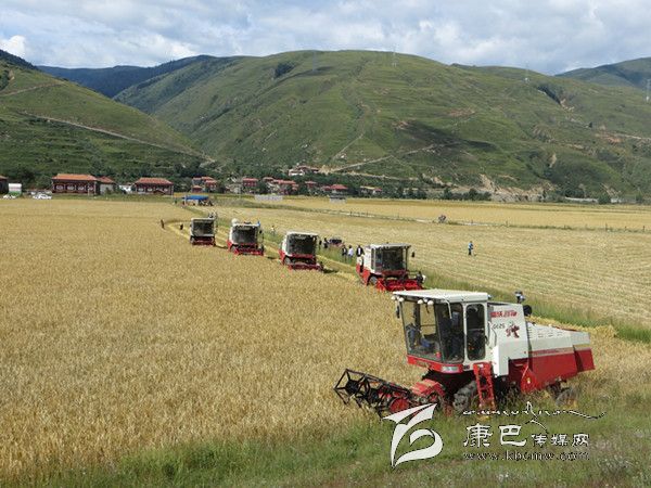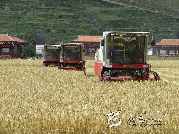 本網訊(胡筱紅 龍正芳 文/圖) 高原的八月是絢麗多彩的時節(jié),是糧食收獲的季節(jié)。爐霍縣300畝全程機械化青稞作業(yè)示范片項目機收工作于8月20日正式啟動,共出動大型聯(lián)合收割機5臺、拖拉機5臺同時作業(yè),正常情況下一臺收割機一天可以收割65至70畝,青稞示范片不出5天就能完成收割。對比以往的種植和收獲方式,全程機械化作業(yè)從播種到收獲帶來的社會效益及經濟效益都遠遠高于傳統(tǒng)種植方式。