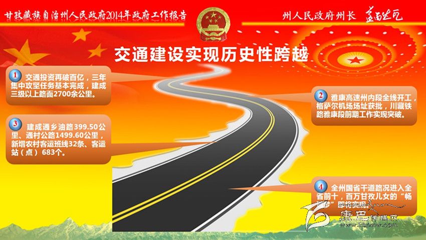 交通建設(shè)實現(xiàn)歷史性跨越。交通投資再破百億,建成三級以上路面2700余公里。雅康高速州內(nèi)段全線開工,格薩爾機場場址獲批,川藏鐵路雅康段前期工作實現(xiàn)突破。建成通鄉(xiāng)油路399.5公里、通村公路1499.6公里,新增農(nóng)村客運班線32條、客運站(點) 683個。全州國省干道路況進入全省前十。徹底告別無電鄉(xiāng)歷史。完成投資100億元,“電力天路”等項目順利實施,“川藏聯(lián)網(wǎng)” 工程提前半年建成投運;18個縣實現(xiàn)與主網(wǎng)連網(wǎng);“遠(yuǎn)村點亮”全面完成。城鄉(xiāng)面貌煥然一新。堅持建好縣城,全州市政基礎(chǔ)設(shè)施有效提升。堅持做大集鎮(zhèn),改造小城鎮(zhèn)危舊房1118戶;投入1.34億元完善姑咱、馬尼干戈、香格里拉、八美4個省級“百鎮(zhèn)試點”鎮(zhèn)市政設(shè)施,13個鄉(xiāng)獲準(zhǔn)撤鄉(xiāng)建鎮(zhèn)。堅持做美村寨,成功創(chuàng)建45個省級“美麗鄉(xiāng)村”示范村,19個州級幸福美麗新村試點建設(shè)全面啟動,打造新村聚居點235個,建成藏區(qū)新居1.11萬戶。全州城鎮(zhèn)化率達到27%。通信覆蓋越來越廣。完成投資4.53億元,國省干線和主要旅游景區(qū)通信網(wǎng)絡(luò)實現(xiàn)連續(xù)覆蓋。生態(tài)底色更加鮮明。編制完成《甘孜州生態(tài)文明建設(shè)規(guī)劃》,落實國家生態(tài)功能區(qū)轉(zhuǎn)移支付資金6.8億元,生態(tài)保護與建設(shè)工程加快推進,草原植被、森林覆蓋率分別達到78%、33.04%。