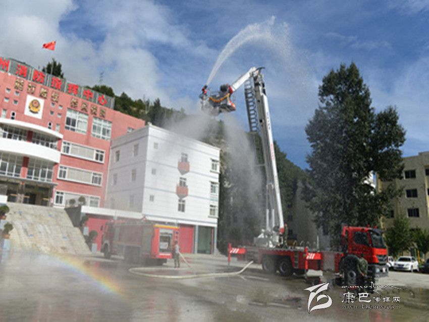 本網(wǎng)訊(劉國謙文/圖)9月8日上午,甘孜消防支隊操場衛(wèi)聳立著一道“銀色天梯”,筆者在現(xiàn)場目擊了 DG-32C登高平臺消防車的變形過程。隨著 4個支撐架的展開,車體被架離地面,登高平臺臂緩緩上升,如“擎天柱”般伸向云端。在兩名駕駛員的配合操作下,平臺頂端配載的水炮噴射出一條長長的水龍,隨著水壓漸漸加大,奔騰的水龍帶著一道彩虹劃過高空,成為云端深處一道壯觀的麗景。