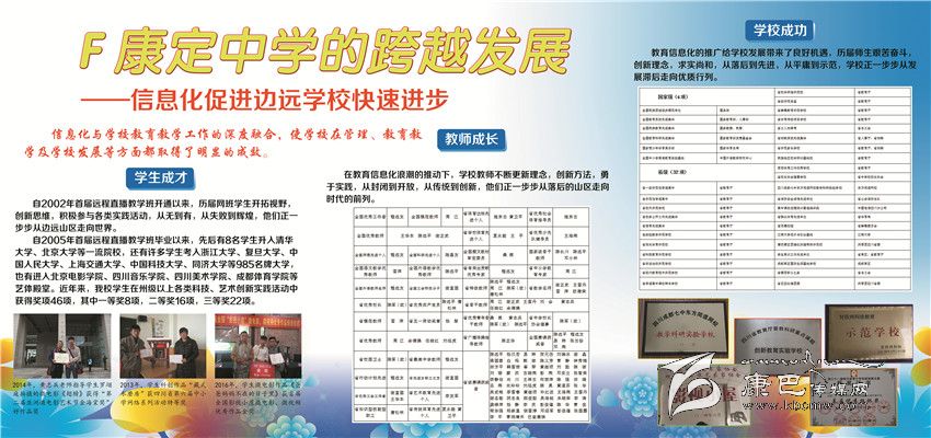 2002年以來康定中學立足民族地區(qū)教育實際,依托成都七中優(yōu)質(zhì)教育,先后開通成都七中高中直播班、初中錄播班,建成初中遠程直錄播教學AB平臺,實現(xiàn)了與國內(nèi)名校共享優(yōu)質(zhì)教學資源的目標,將網(wǎng)課教學打造成學校教育品牌。經(jīng)過近5000名師生員工的不懈努力,2013年來,康定中學連續(xù)4年高考硬上本科人數(shù)突破200人大關。先后有8名學生被北京大學和清華大學錄取。中考綜合評比連續(xù)9年保持全州第一。
