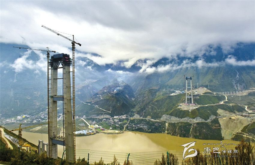 從高處俯瞰,兩座188米高的主墩十分壯觀,在康定一側(cè)的主墩下,汽車(chē)長(zhǎng)龍如同螞蟻一樣大小,沿著318國(guó)道向康定進(jìn)發(fā)。