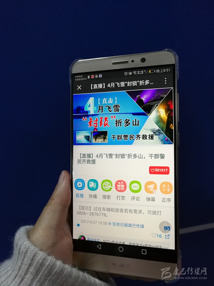 一路上,記者通過甘孜日?qǐng)?bào)微信平臺(tái),將救援情況和群眾的實(shí)況,第一時(shí)間進(jìn)行了直播。隨著一條條現(xiàn)場圖片、文字和視頻的及時(shí)發(fā)布,人們第一時(shí)間得知了折多山受困車輛和群眾得到救助的實(shí)際情況,人們紛紛在直播平臺(tái)留言,為交通、路政和當(dāng)?shù)攸h委、政府的救援行動(dòng)點(diǎn)贊。在對(duì)折多山強(qiáng)降雪和受堵現(xiàn)場進(jìn)行直播報(bào)道的同時(shí),甘孜日?qǐng)?bào)社還利用直播平臺(tái),回顧了折多山道路交通難的歷史,并再次發(fā)布雅康高速修建、折多山隧道立項(xiàng)等重大交通建設(shè)工程的進(jìn)展情況,又對(duì)此次折多山風(fēng)雪阻斷道路交通,導(dǎo)致車輛和人群滯留的特殊原因進(jìn)行了報(bào)道和澄清,并報(bào)道了風(fēng)雪中仍有不少徒步游客繼續(xù)甘孜之旅的情況,第一時(shí)間讓更多的人了解到,飛雪并未對(duì)道路造成致命影響,甘孜州的道路交通狀況和應(yīng)急處置能力已經(jīng)得到了極大的提升,完全有能力保障人們出行以及生命、財(cái)產(chǎn)安全。