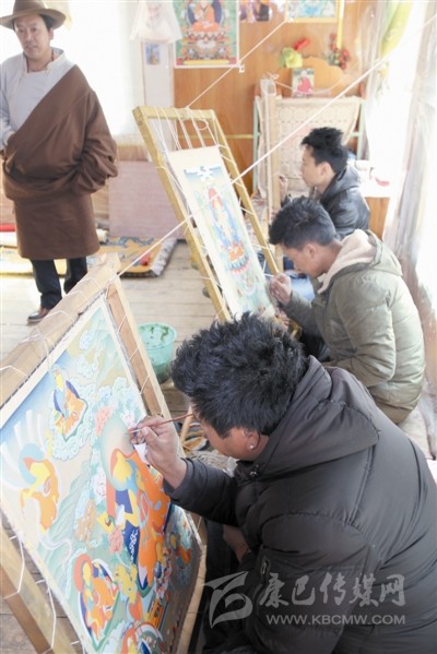 白玉河坡省級(jí)非遺代表性傳承人根秋單貞指導(dǎo)唐卡繪畫(huà)。