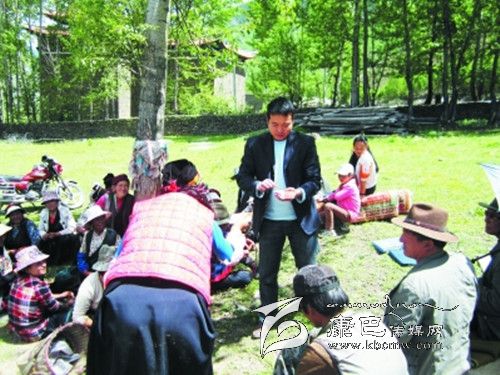 康定縣農(nóng)村信用合作社職工下鄉(xiāng)宣傳信貸政策,并對村民進(jìn)行評級授信,發(fā)放小額農(nóng)戶信用貸款證。