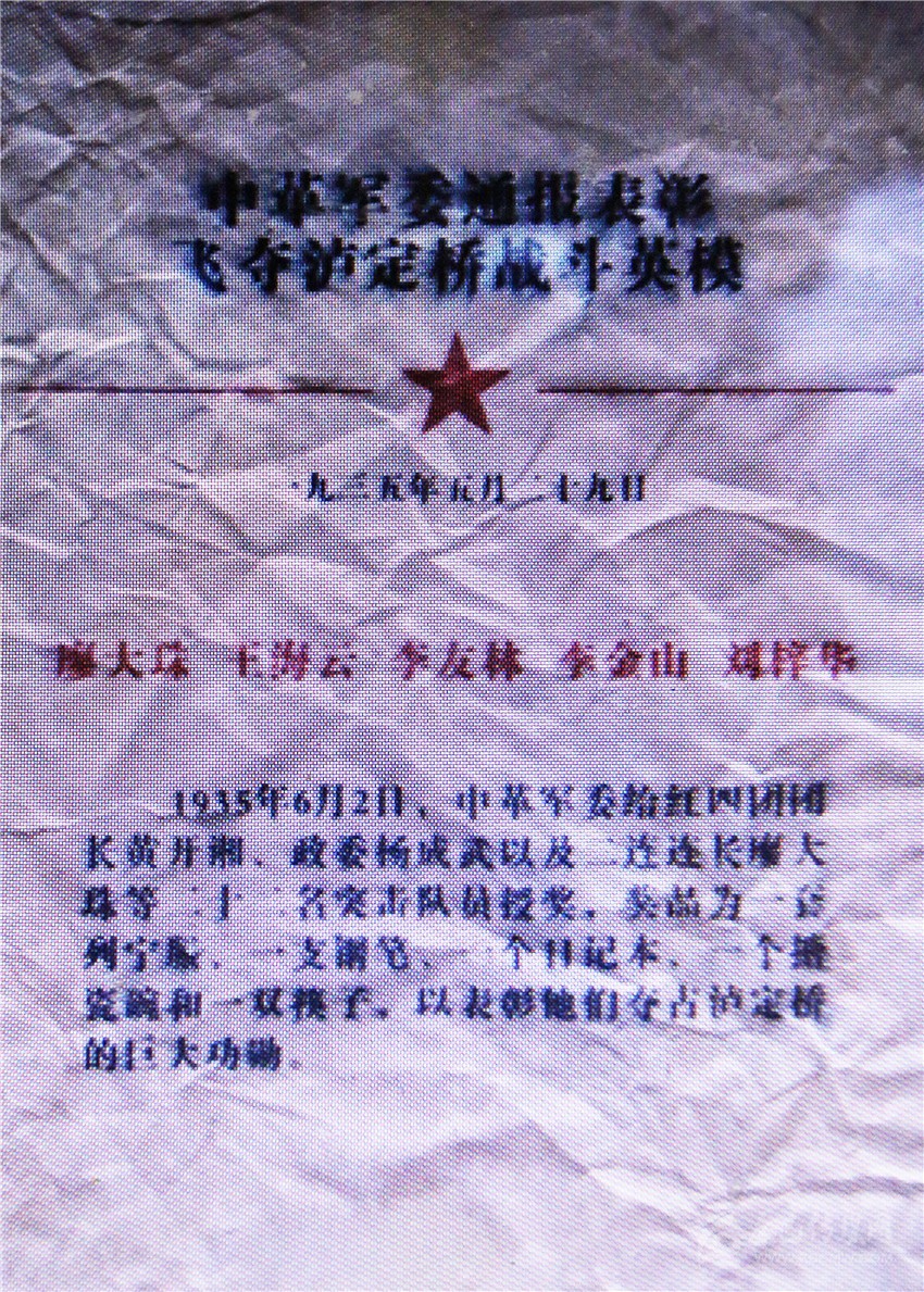 劉東升談起父親當(dāng)年作為飛奪瀘定橋22勇士之一,心情無比激動。“父親當(dāng)年如果不是努力爭取,就沒有后來的勇士稱號,更沒有中革軍委的嘉獎(jiǎng)?!?935年5月,北上抗日的紅軍向天險(xiǎn)大渡河挺進(jìn)。大渡河水流湍急,兩岸都是高山峻嶺,只有一座鐵索橋可以通過。這座鐵索橋,就是紅軍北上必須奪取的瀘定橋。