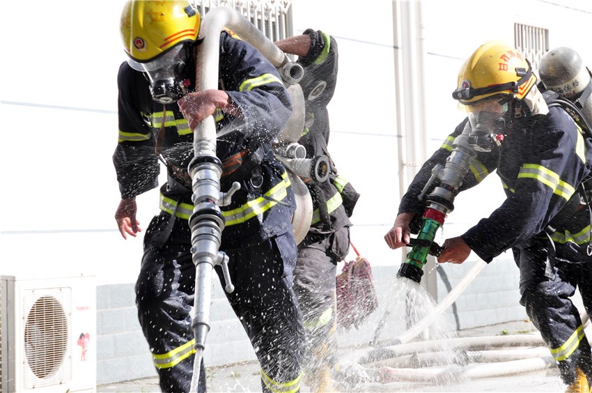 “快點(diǎn)、快點(diǎn)、再快一點(diǎn)。”上午9時(shí),爐城南路消防救援站消防員們身著15公斤戰(zhàn)斗服,帶著高壓水槍水帶,托著60公斤的人體模型,拼命奔跑,中隊(duì)長(zhǎng)李勇不停地為隊(duì)員鼓勁?!皶r(shí)間就是生命,我們平時(shí)的訓(xùn)練就是在和時(shí)間賽跑,和死神賽跑?!崩钣赂嬖V記者,消防員對(duì)于體能要求極高,不僅要跑得快,還要負(fù)重跑?!拔覀儸F(xiàn)在的訓(xùn)練就是模擬火災(zāi)現(xiàn)場(chǎng),消防員在滅火的同時(shí),還要救出被困群眾。這樣的訓(xùn)練每天都會(huì)進(jìn)行,只有平時(shí)多流汗,戰(zhàn)時(shí)才少流血?!崩钣抡f(shuō)。