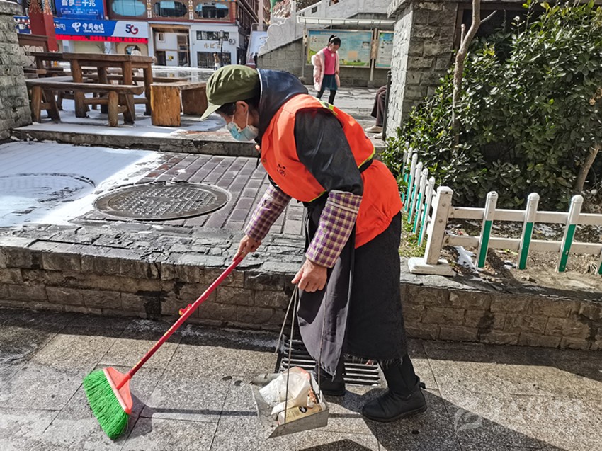 1月30日,農(nóng)歷大年廿九,在康定市的街道,環(huán)衛(wèi)工人宋光芳已穿好工作服,拿著掃帚和撮箕,仔細地清掃路面。自2012年,宋光芳從事環(huán)衛(wèi)工作,到現(xiàn)在已經(jīng)10個年頭了,在這10年里,她每天早出晚歸,耕耘在環(huán)衛(wèi)工作第一線。為了給市民營造干凈、舒適的節(jié)日環(huán)境,今年春節(jié)她仍和往年一樣堅守在工作崗位上,保證城市干凈衛(wèi)生的環(huán)境。
