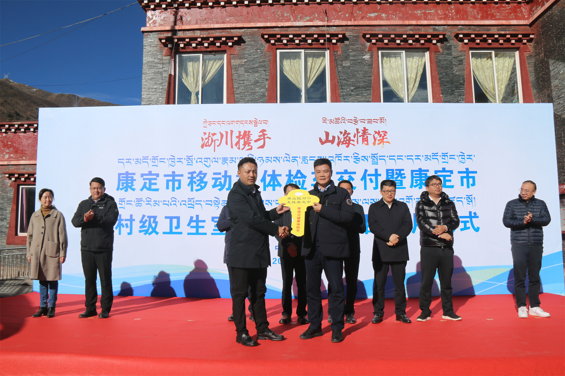 圖為杭州市蕭山區(qū)對(duì)口支援康定市移動(dòng)式健康體檢車暨康定市“鄉(xiāng)村振興醫(yī)療發(fā)展計(jì)劃(村衛(wèi)生室提升改造)”項(xiàng)目交付儀式。