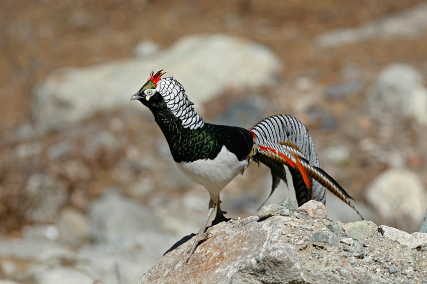 白腹錦雞(學(xué)名:Chrysolophus amherstiae):藏語譯音:甲嚇破呷妞仁 別名:銅雞、寬寬雞 國家II級(jí)保護(hù)動(dòng)物,見于瀘定、康定、丹巴、九龍等。 雄鳥全長(zhǎng)約140厘米,雌鳥約60厘米。雄鳥頭頂、背、胸為金屬翠綠色;羽冠紫紅色;后頸披肩羽白色,具黑色羽緣;下背棕色,腰轉(zhuǎn)朱紅色。飛羽暗褐色。尾羽長(zhǎng),有黑白相間的云狀斑紋。腹部白色。嘴和腳藍(lán)灰色。雌鳥上體及尾大部棕?