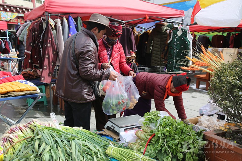 記者看到,集市上圍滿(mǎn)了背著背簍采購(gòu)年貨的群眾,他們有的拿著新款式的藏裝比來(lái)比去,有的對(duì)著圖案豐富的藏毯左挑右選,有的在購(gòu)買(mǎi)商品“犒勞自己”,有的在為后輩“獻(xiàn)著愛(ài)心”,大家都在選購(gòu)著心儀的年貨。
