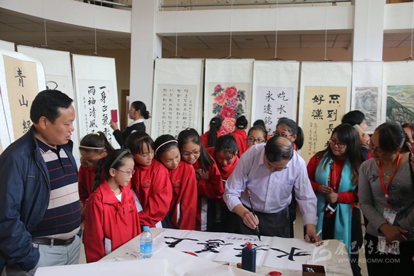 “五老”送書畫進(jìn)校園。