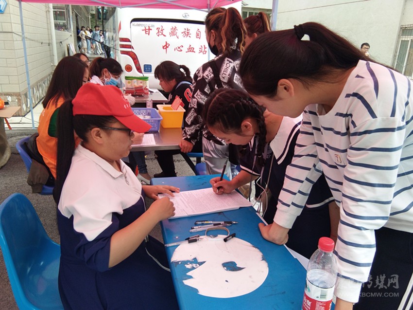 四川民族學(xué)院師生和志愿服務(wù)隊在校園內(nèi)開展無償獻(xiàn)血活動。