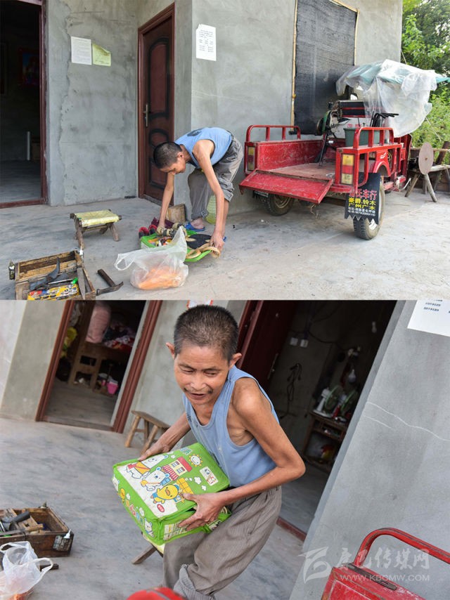 “周強善曾是全鄉(xiāng)最困難的貧困戶?!敝行泥l(xiāng)黨委書記楊壘說,周強善的妻子在剛生下女兒后因病去世。2005年,他在外務(wù)工時右腿受傷,留下殘疾。后來他自學補鞋技術(shù),成了一名鞋匠,但腿腳不便、下山路不通,三娃多年“悶”在家里。