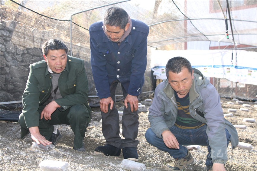 鄧順均(左一)正在查看羊肚菌長勢情況。本網(wǎng)記者 馬建華 攝