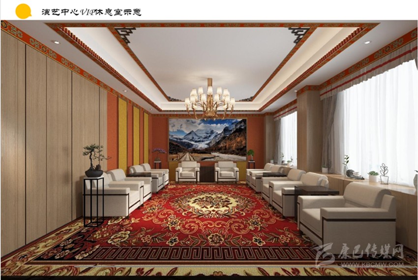 藏式繪畫、門板藏式浮雕造型、藏式鼓架、展示康定城的浮雕........記者看到,效果圖中農牧民演藝中心的設計充滿了“傳統(tǒng)文化”的味道。頂部設計利用了線條的柔韌性和律動性,使空間更有線條感,看起來像康定的潺潺河流,墻面分別使用樂器、山巒疊成的變化形式,營造出獨特的民族風情。通過自熱和人文的結合展示出康定人民樂觀向上、民族團結的和樂畫面。地面設計采用了暖(冷)色座椅與富有民族特色的色彩搭配,營造出一種身處藏家,暢游藏文化海洋的意境。