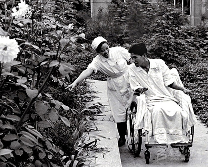松田宏也在四川醫(yī)學(xué)院附屬醫(yī)院護(hù)士長(zhǎng)陳克芳的護(hù)理下來到花園里。 資料圖片