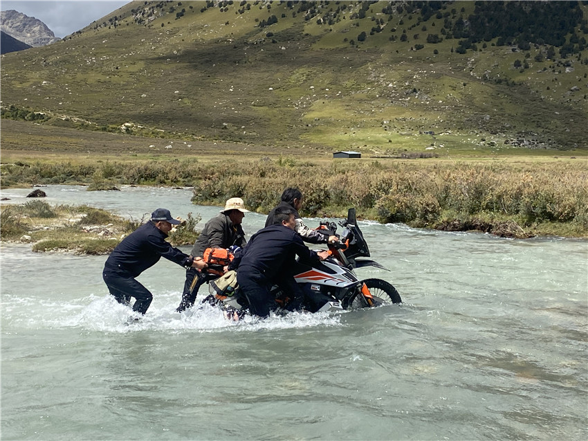 上午12時許,禾尼中心派出所輔警澤仁貢布和軍軍出警救援。兩人同附近的牧民群眾一起,讓一名騎友騎在摩托車上掌控方向,其他人扶著摩托車,將摩托車推上岸。此時,距離他們下河救援已經(jīng)過去半個多小時了,他們上岸后才發(fā)現(xiàn),雙腿已經(jīng)失去了知覺,打濕的衣褲被寒風一吹,凍得直發(fā)抖。
