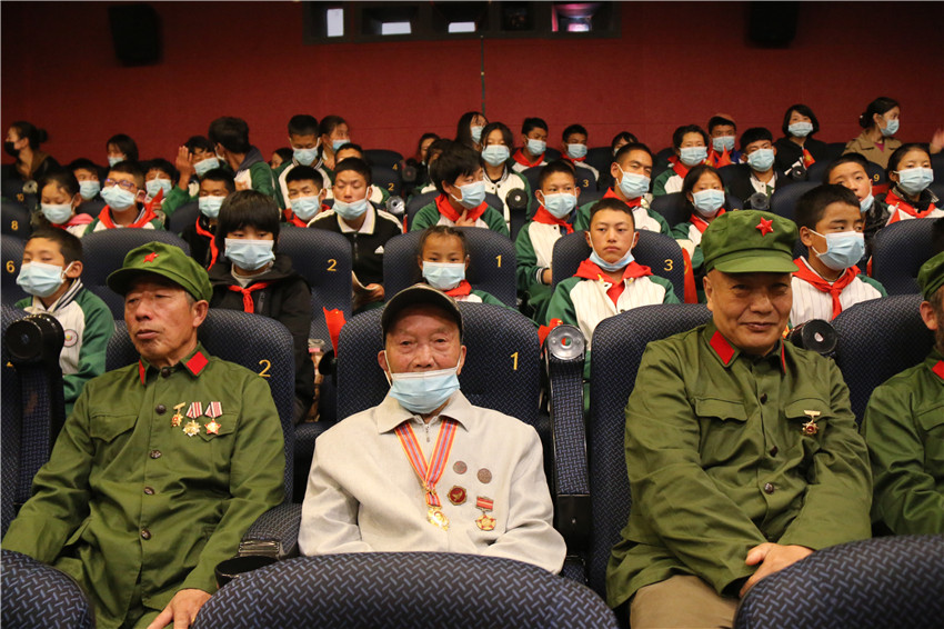 圖為95歲的抗美援朝老兵陳忠(前排中)和退役軍人代表、州特殊教育學(xué)校學(xué)生一起觀看電影《長津湖》。