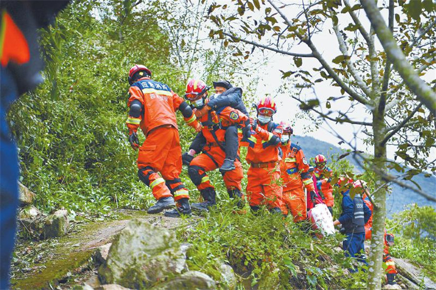 救援隊(duì)員協(xié)助紫雅場(chǎng)村最后一批村民下山,他們隨后將通過(guò)水路轉(zhuǎn)移至設(shè)在得妥鎮(zhèn)場(chǎng)鎮(zhèn)的受災(zāi)群眾安置點(diǎn)。 四川日?qǐng)?bào)全媒體記者 楊樹(shù) 攝