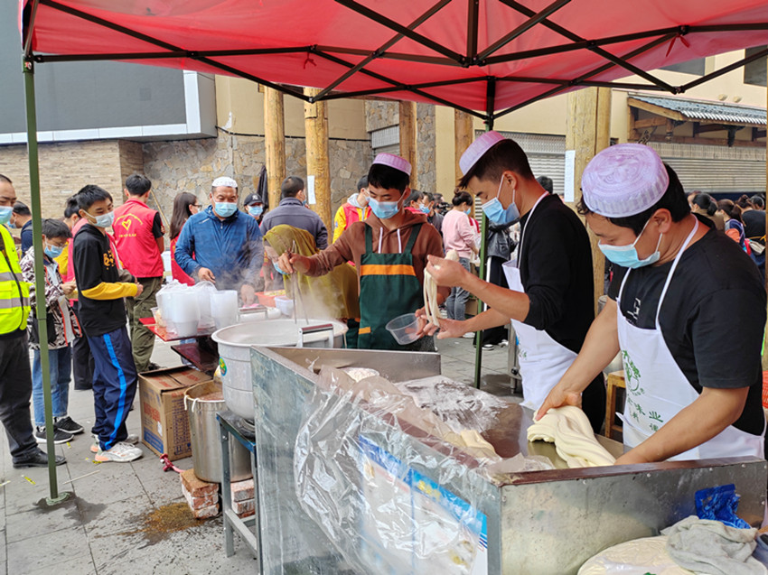 7天時間里,“拉面哥”攤位全員每日工作10余小時,為震中百姓和救災人員免費送上近7000碗“愛心面”。在張奴合看來,這是大家共同烹制出的一碗碗“團結面”。