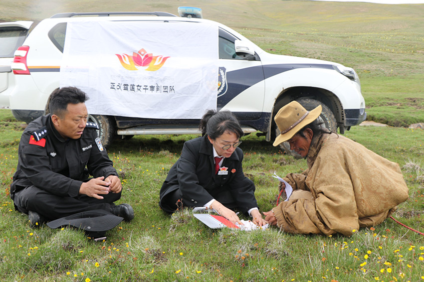 在草地上、田野里設(shè)置巡回法庭是“正義雪蓮”女子審判團(tuán)隊(duì)常見的開庭形式。這樣的方式不僅方便群眾,就近辦案、減輕訴累,也大大提高了法院的辦案效率。在團(tuán)隊(duì)里,一些本土女法官熟悉地方文化習(xí)俗,精通當(dāng)?shù)胤窖裕齻冊(cè)谵k案中也常常巧妙借用一些好的傳統(tǒng)習(xí)俗解決矛盾糾紛,使司法不僅有剛性的定紛止?fàn)帲灿腥嵝缘臏嘏刈o(hù),她們像雪蓮一樣維護(hù)高原江南的公平正義。