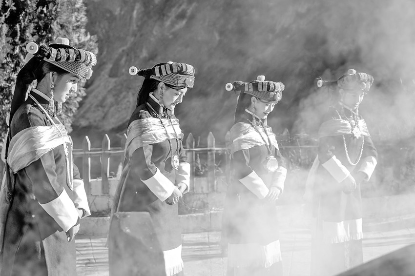 嘉賓體驗團首先來到位于甲居藏寨景區(qū)里的“點石·寶生居”特色民宿,只見一位年邁的嘉絨長者正主持“成人禮”儀式,桑煙裊裊,為即將成年的少女送去了誠摯祝福。完成儀式的嘉絨姑娘們隨長者一同跳起了非遺傳統(tǒng)舞蹈孔雀鍋莊,千年前東女古國的風采得以重現。