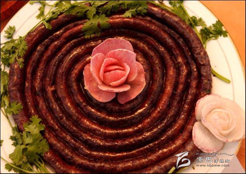 (4)血腸的烹煮,將灌好的血腸,放開湯中煮沸,煮至血腸浮起,腸成灰白色,約八成熟時(shí)便起鍋,裝入盤內(nèi),全家席地圍坐,割而食之。
