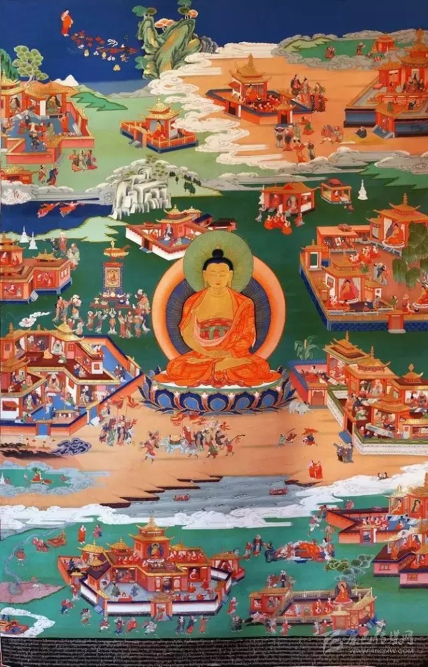 這套《如意寶藤》唐卡畫是在十七世紀,東谷寺第六世活佛降巴更登嘉措命畫師郎卡杰繪制而成。傳說在十七世紀,在今爐霍縣境內(nèi)的一個地方,有戶農(nóng)民家生了一名聰明伶俐的小男孩,因其家境貧困從小就當童工,為別人放牧維持生活,其乳名為孜珠(牧童)。孜珠非常喜歡繪畫,平常利用放牧的空閑學畫,沒有紙張筆墨,晴天里他把地當紙,用小棍做筆, 陰天用石板作紙,小石子作筆每天堅持學習繪畫。他在極其艱苦的環(huán)境中,勤學好問,刻苦鉆研繪畫知識及其基本技巧。他刻苦學畫的恒心和誠意,感動了神仙畫師毗首羯摩。在一個良辰吉日神仙畫師來到人間收孜珠為徒,把自己的所有知識傳授于他。