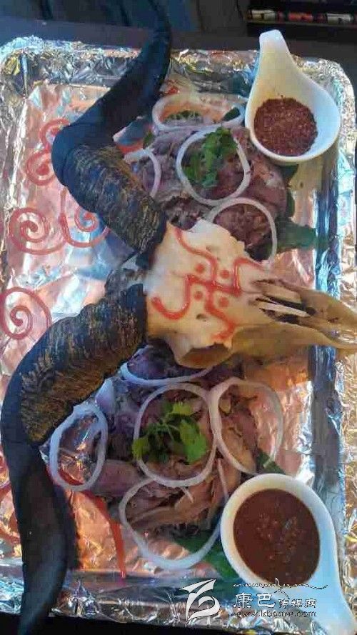 最值得一提的應(yīng)該是兩盤放在羊頭邊上的蘸料。一盤是四川的干辣椒面,里面放了鹽、味精、花椒,是大部分人都能接受的口味。而另一盤辣椒是西藏獨有的藏式辣椒醬,該辣椒的香辣和印度魔鬼椒有得一拼。藏式辣椒是使用涼水調(diào)和而成,只放一些鹽在里面,用羊頭肉沾上那么一點放在嘴里,立刻能感覺到辣味直襲你的味蕾神經(jīng)進(jìn)入你的大腦,形成一個字“辣”。如果你是不怕的,喜歡吃辣的食客,不妨試試這道“吉祥羊頭”帶給你的火爆。