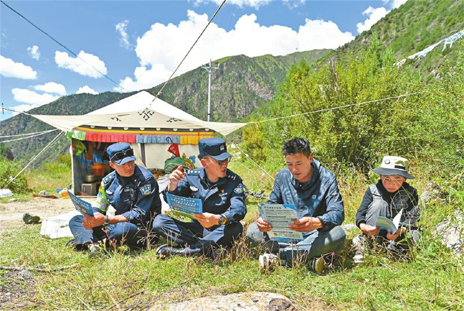 “甲日村有幾戶牧民是前幾天剛遷徙過來的,我們?nèi)ソo他們進(jìn)行一次法治宣講,也去了解下他們有沒有辦理身份證、戶口的需求。他們住在河那邊,出行也不方便?!毖采饺蝿?wù)結(jié)束后,趁著大家吃干糧休整的時(shí)間,登真扎巴對(duì)大家說。