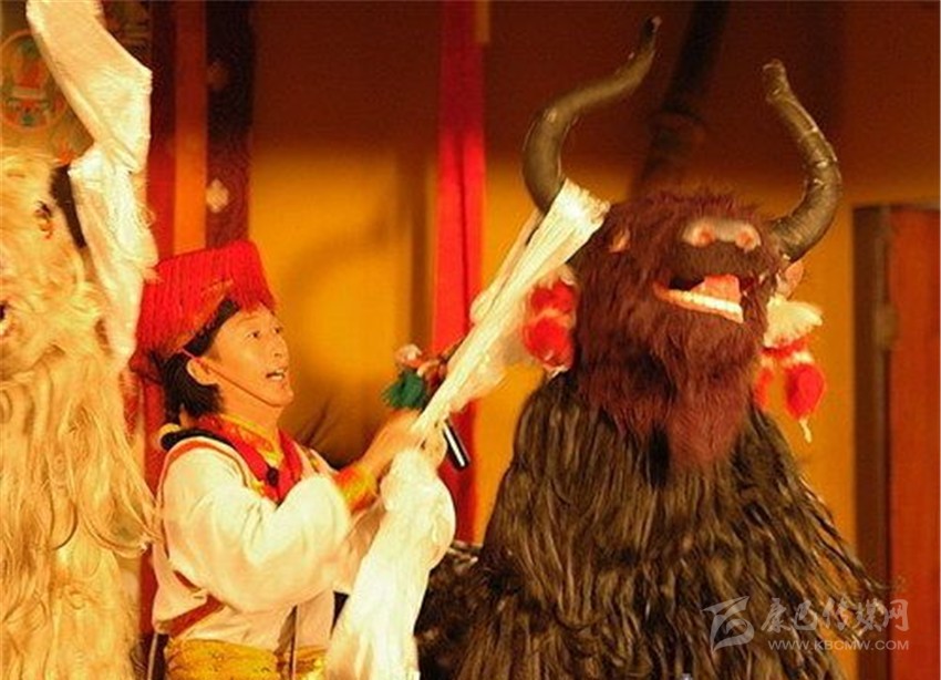 之后,由演員扮演的牦牛會上場,牦牛由兩個演員扮演。一黑一白兩頭牦牛。關(guān)于白牦牛和黑牦牛的象征意義,說法不一,有的說白牦牛象征前藏地區(qū),黑牦牛象征后藏地區(qū);有的說白牦牛象征溫順和善良,黑牦牛象征勇猛和彪捍。
